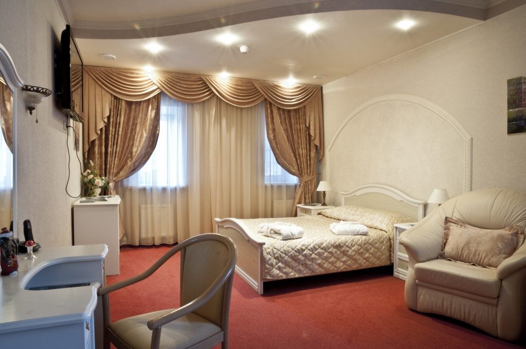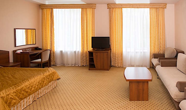 Оснащение двуспальная/2 односпальные кровати, 2 прикроватные тумбочки, туалетный столик, шкаф, телефон, телевизор, шкаф, вешалка, зеркало, раскладной диван, кресла, мини-бар, душевая кабина, ванна, фен