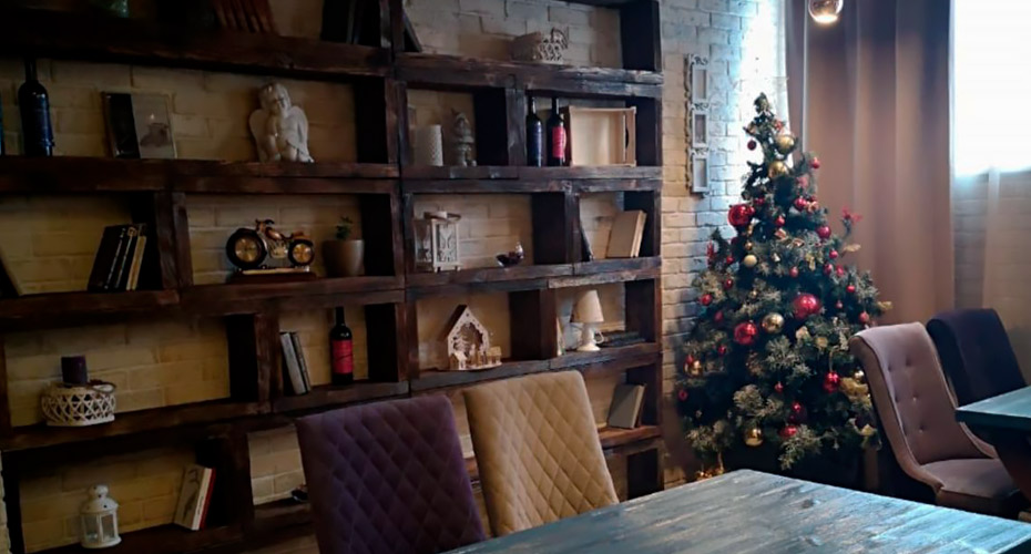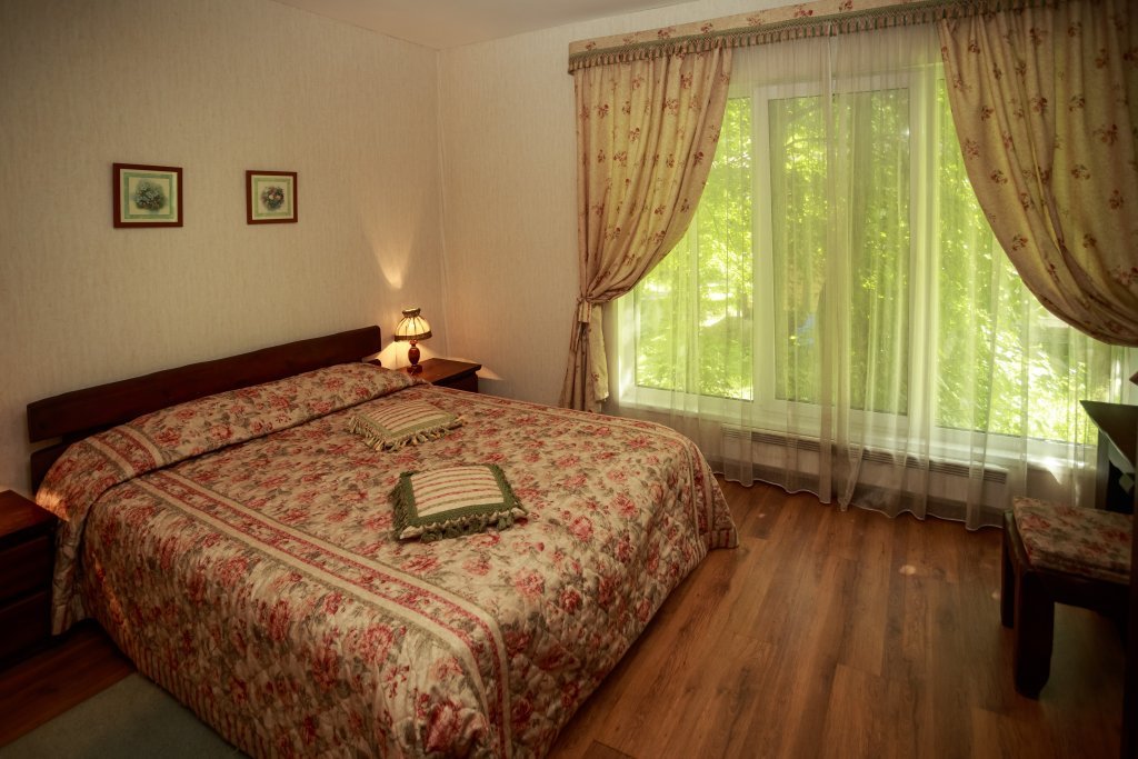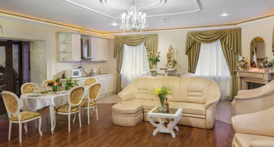 Оснащение двуспальная кровать, журнальный столик, 2 кресла, раскладной диван, электрический камин, телевизор, обеденный стол, стулья, кухонный уголок, микроволновая печь, холодильник, шкаф, туалетный столик, комод, душ